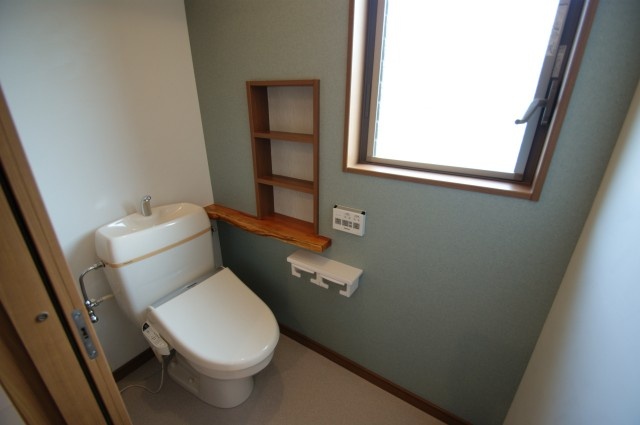 トイレに本棚とイチイの天然木カウンターを取り付けました。